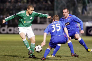 Οι «πράσινοι» μπήκαν στον αγώνα αποφασισμένοι να αποδείξουν ποιος είναι το «αφεντικό». Το αναμενόμενο «ροτέισον» του Πεσέιρο δεν επηρρέασε τη συνοχή της ομάδας, που είχε την υπεροχή και περιόρισε σε παθητικό ρόλο τους φιλοξενούμενους. Βέβαια, το γρήγορο γκολ έπαιξε ρόλο στην εξέλιξη του παιχνιδιού. Στο 12΄ ο Γκούμας, με πλάτη στο τέρμα, έπιασε ένα δυνατό βολέ και «κεραυνοβόλησε» τον ΜακΓκρέγκορ, ο οποίος βρισκόταν εκτός θέσης. Δέκα λεπτά αργότερα, ο αρχηγός του Παναθηναϊκού έφτασε κοντά σε ένα δεύτερο γκολ, όταν σούταρε δυνατά μέσα από την περιοχή, αλλά ο ΜακΓκρέγκορ πήρε... ρεβάνς αποκρούοντας εντυπωσιακά. Η αμυντική γραμμή του Παναθηναϊκού λειτούργησε άψογα, αλλά ακόμα κι όταν ο Βύντρα «έχασε» το Νάτσο Νόβο, ο Μάριο Γκαλίνοβιτς ήταν εκεί για να αποκρούσει με έξοχα αντανακλαστικά το σουτ του Ισπανού. Στο ξεκίνημα του β΄ ημιχρόνου η Ρέιντζερς ήταν πιο επιθετική -δεν είχε άλλωστε άλλη επιλογή- αλλά γρήγορα ο Παναθηναϊκός ισορρόπησε ξανά το παιχνίδι και το έφερε στο δικό του ρυθμό. Βέβαια, όσο το ματς βρισκόταν στο 1-0, η αγωνία των φίλων του «τριφυλλιού» που γέμισαν το «Απόστολος Νικολαϊδης» γινόταν ολοένα και μεγαλύτερη. Ο Μάτος είχε την ευκαιρία να τους... απαλλάξει, όμως δεν πρόλαβε να «σπρώξει» τη μπάλα στα δίχτυα, στο 78΄. Η Ρέιντζερς περίμενε την (μοναδική) ευκαιρία της κι αυτή είχε -δυστυχώς για τον Παναθηναϊκό- θετική κατάληξη. Στο 81΄, από σέντρα του Μπερκ και λάθος διώξιμο του Μόρις, ο Νάτσο Νόβο βρέθηκε σε θέση που... δεν μπορούσε να ασχοχήσει. Κόντρα στο ρυθμό του αγώνα, οι Σκοτζέζοι ισοφάρισαν και άφησαν τον Παναθηναϊκό εκτός συνέχειας... Διαιτητής: Φέλιξ Μπριχ (Γερμανία) Κίτρινες: Ντέιλι ΠΑΝΑΘΗΝΑΪΚΟΣ (Ζοζέ Πεσέιρο): Γκαλίνοβιτς, Βύντρα, Μόρις, Γκούμας, Νίλσον (86΄ Παπαδόπουλος), Μάτος, Τζιόλης (83΄ Γκονζάλες), Καραγκούνης, Ίβανσιτς, Ποστίγκα (62΄ Ντόι), Σαλπιγγίδης ΡΕΪΝΤΖΕΡΣ (Γουόλτερ Σμιθ): ΜακΓκρέγκορ, Μπρόουντφουτ, Γουίρ, Κουέγιαρ, Πάπατς (66΄ Νέισμιθ), Νόβο, Φέργκιουσον, Χεμντανί (69΄ Μπερκ), Άνταμ (66΄ Ντέιλι), Μπόιντ, Ντέιβις